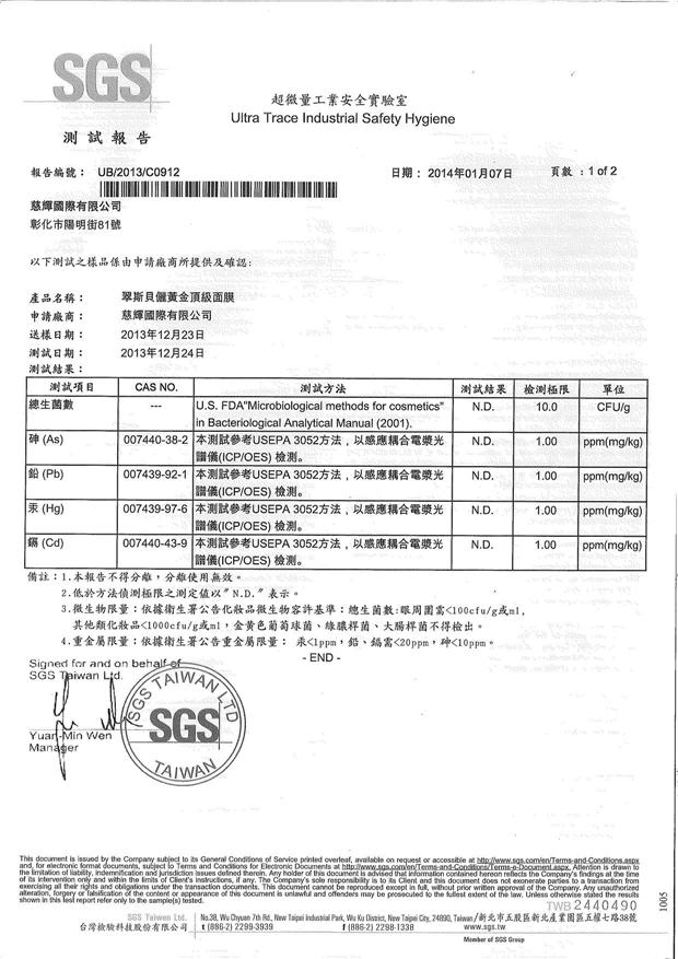 翠斯貝儷黃金頂級面膜其主要成分來自瑞士、法國、日本。市售的面膜可分成三大類,第一類:淨白。第二類:保濕。第三類:撫平細紋。本公司研發黃金頂級面膜是三合一,一片完成。本公司出品黃金頂級面膜是能撫平細紋產品。讓我們的臉部肌膚水嫩、緊緻、緊實、富有彈性,展現自信迷人風采。